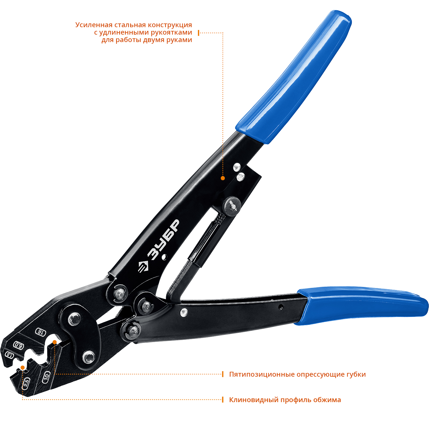 Рычажная конструкция обеспечивает удобство в процессе обжима наконечников