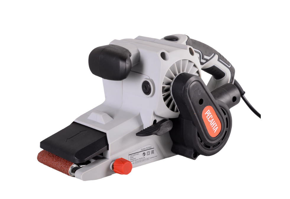 Машина оснащена двигателем мощностью 900 Вт, который обеспечивает скорость движения ленты до 360 м/мин, что позволяет быстро обрабатывать значительные площади поверхностей. Для удобства оператора предусмотрена кнопка фиксации выключателя, которая избавляет от необходимости постоянно удерживать палец на пусковой кнопке, значительно снижая утомляемость при продолжительной работе.