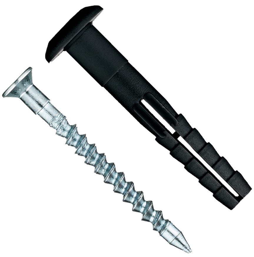 Особенности: для установки необходимо предварительно просверлить отверстие. Прочность крепежа достигается расклиниванием дюбеля в отверстии гвоздем в момент удара молотком. С помощью крестообразного шлица на головке гвоздя можно легко ослабить или усилить крепеж, демонтировать его. Более надежное крепление благодаря большой площади соприкосновения с прикрепляемой деталью.
