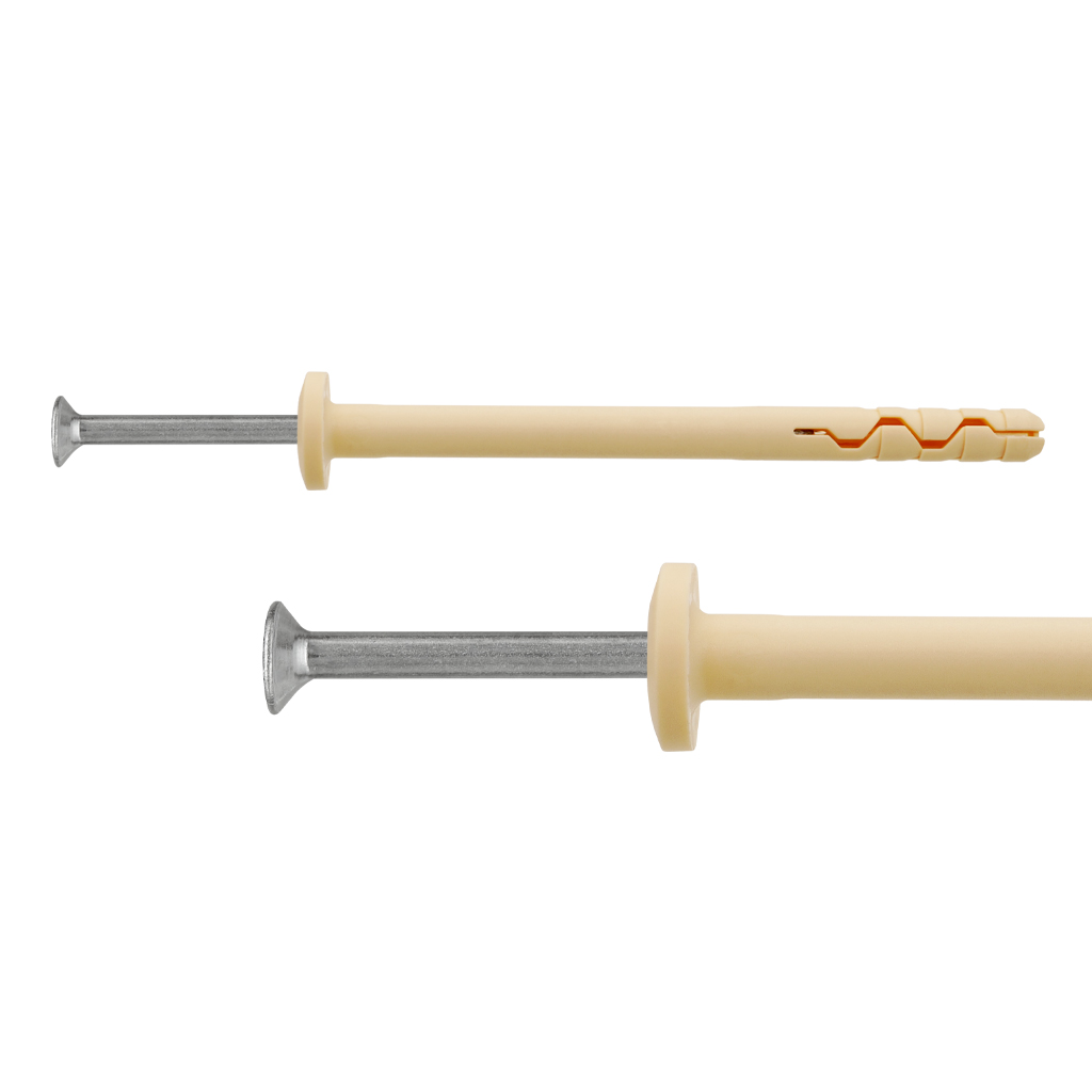 Монтаж дюбель-гвоздя осуществляется легко и быстро с помощью одного молотка. Большая нерабочая часть дюбеля позволяет осуществлять монтаж сквозь прикрепляемый материал. Гвоздь заранее установлен в дюбель.
