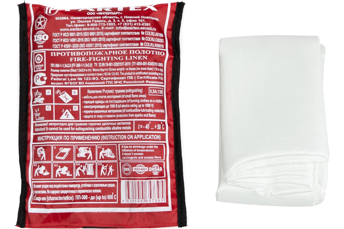 «Противопожарное полотно 1,5 х 2 м (ПП-300)» работает по принципу прекращения доступа кислорода к очагу воспламенения, тем самым предотвращая его распространение.