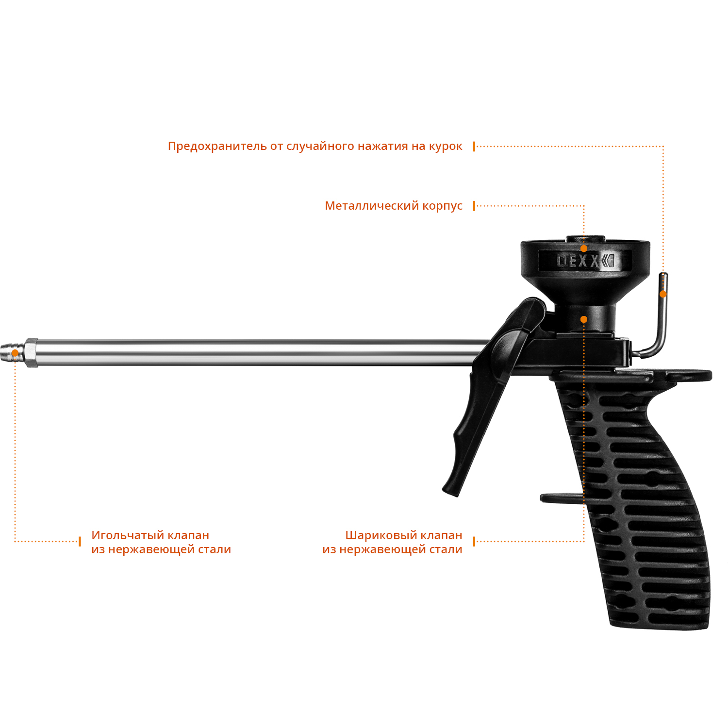 Ствол и игольчатый клапан из металла увеличивают ресурс инструмента.