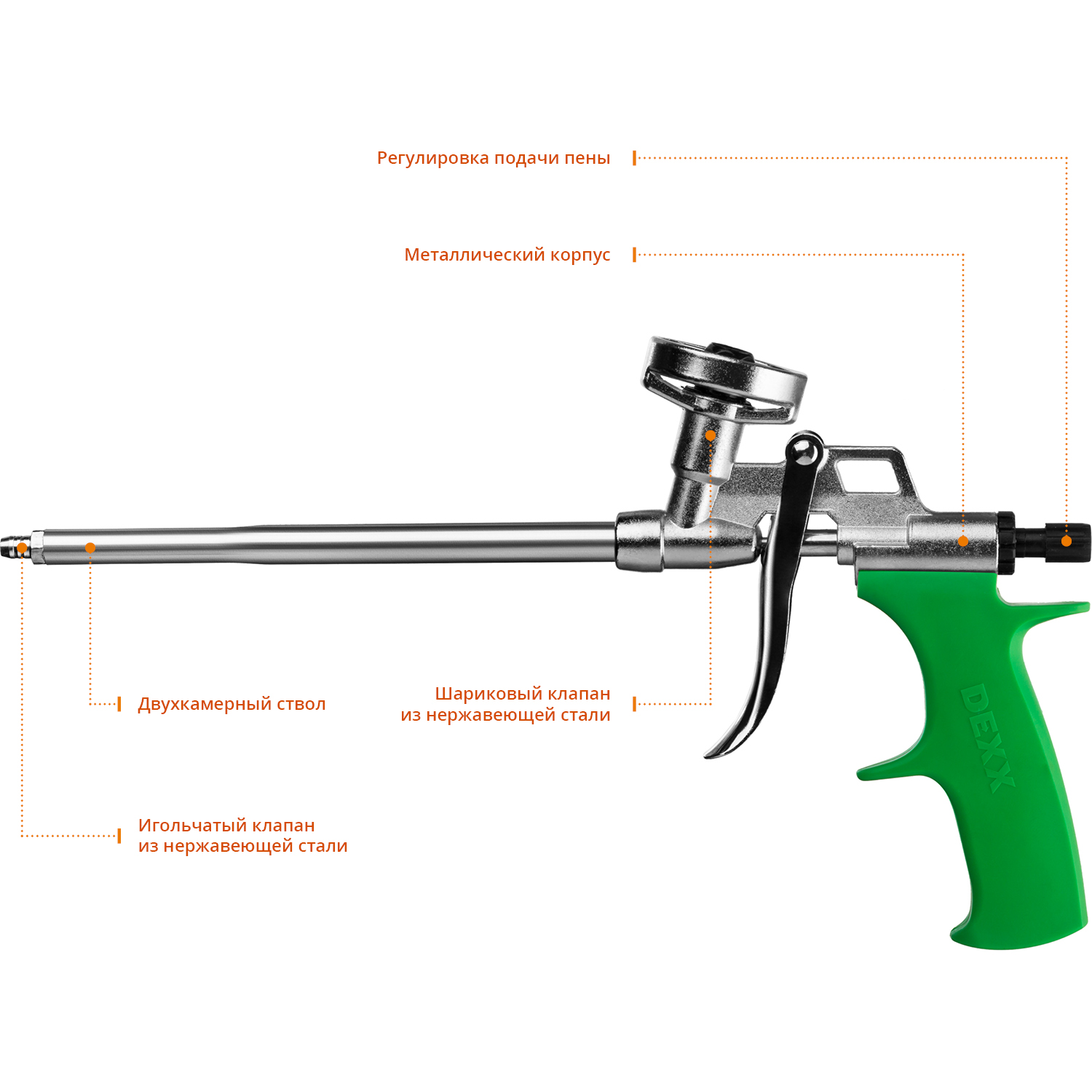 Ствол и игольчатый клапан из нержавеющей стали увеличивают ресурс инструмента.