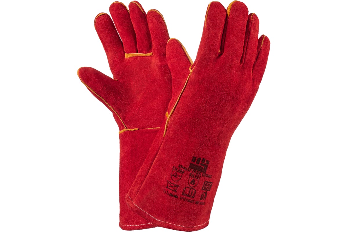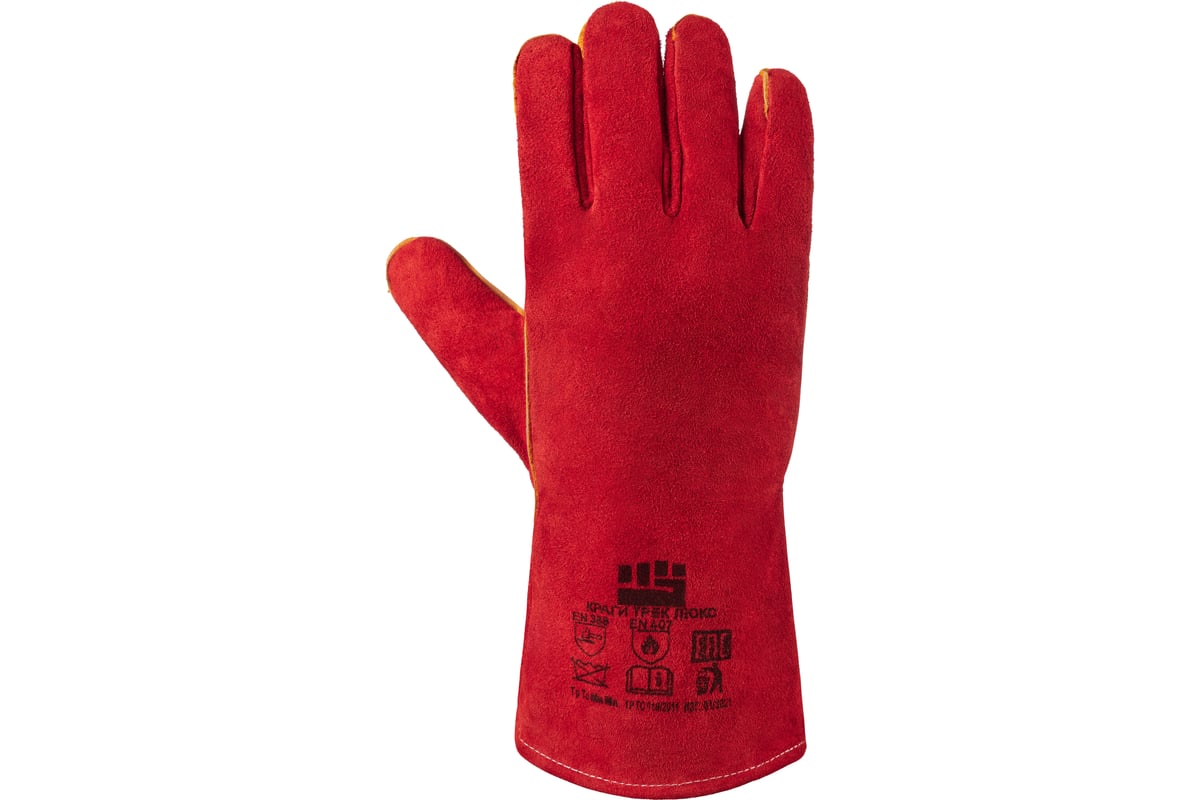У данного вида краг используется спилок КРС однородный, 1,2+/-0,1 мм, шлифованный, окрашенный. Швы усилены вставками из кожи черного цвета. Краги обеспечивают высокую механическую защиту, защиту от повышенных температур - открытого пламени, искр и брызг расплавленного металла. Краги спилковые Трэк Люкс имеют широкий раструб, что обеспечивает лёгкость сбрасывания с руки. Данная особенность очень важна при работе сварщика.