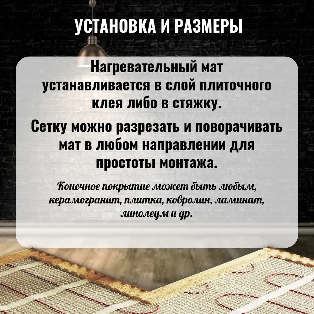 это готовый для монтажа продукт (в комплект входят нагревательный мат, монтажная трубка для терморегулятора, руководство по установке и эксплуатации); простой монтаж: достаточно лишь разложить маты, установить датчик температуры и покрыть их плиточным клеем. Для управления температурой пола Вам понадобится терморегулятор (в комплект нагревательных матов не входит).Технические характеристики: Одноточечное соединение,двухжильный кабель,отсутствие излучения ЭМП(электромагнитное поле).Безопасно для влажных мест. Легкость монтажа. Долговечная конструкция. Гарантия 15-лет для производственных дефектов.