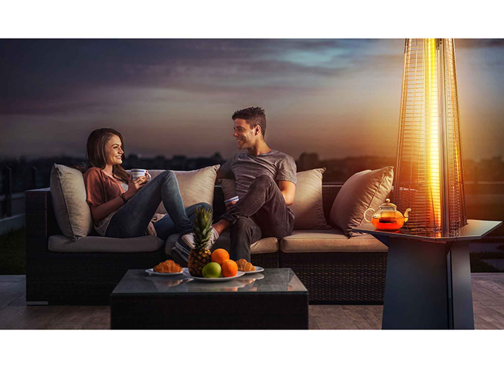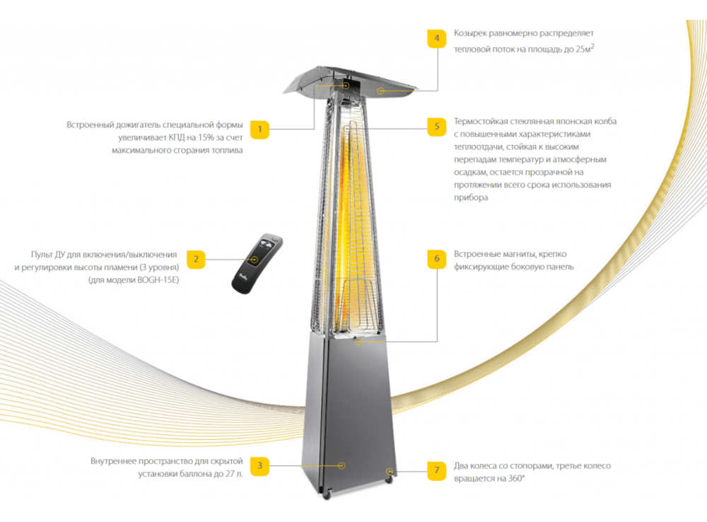 Изготовлен из легированной нержавеющей стали и защищен от попадания атмосферных осадков сверху четырехгранным отражателем. Датчик наклона отключает пламя при наклоне газового обогревателя более чем на 45°, термоэлектрический датчик и электромагнитный клапан сразу же останавливают подачу газа в критических ситуациях, таких как затухание пламени или утечка газа. За счёт встроенной колёсной базы можно перемещать по любой поверхности