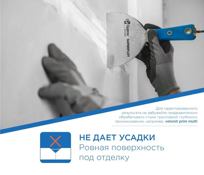 Не дает усадки, обеспечивая ровную поверхность стыка под финишное покрытие