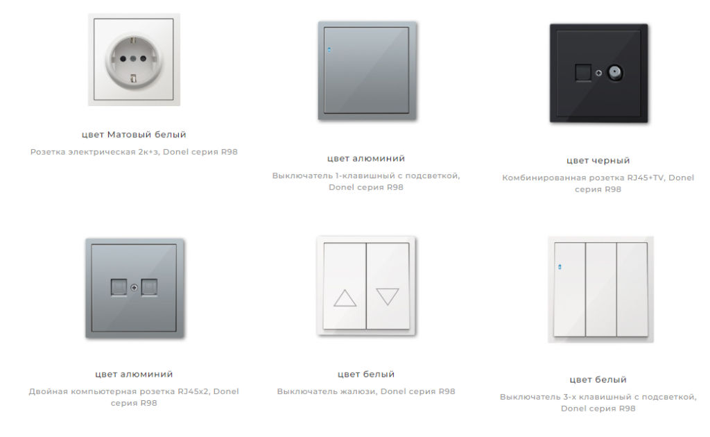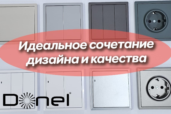 Серия электроустановочных изделий Donel R98 представляет собой идеальное сочетание сдержанного скандинавского дизайна и высококачественных материалов в элегантных цветах. В линейке доступны варианты, такие как черный матовый, матовый карбон, серебристый алюминий, белый глянцевый, матовый кашемир, сталь, матовый белый, а также глубокие оттенки: матовый изумруд, матовый шоколад и матовый серый. Коллекция включает в себя механизмы скрытой установки, такие как выключатели, розетки, разъёмы, а также ТВ, SAT и RJ45. Благодаря разнообразным накладкам и рамкам, пользователи могут создать идеальные многопостовые комбинации, добавив нужную функциональность.